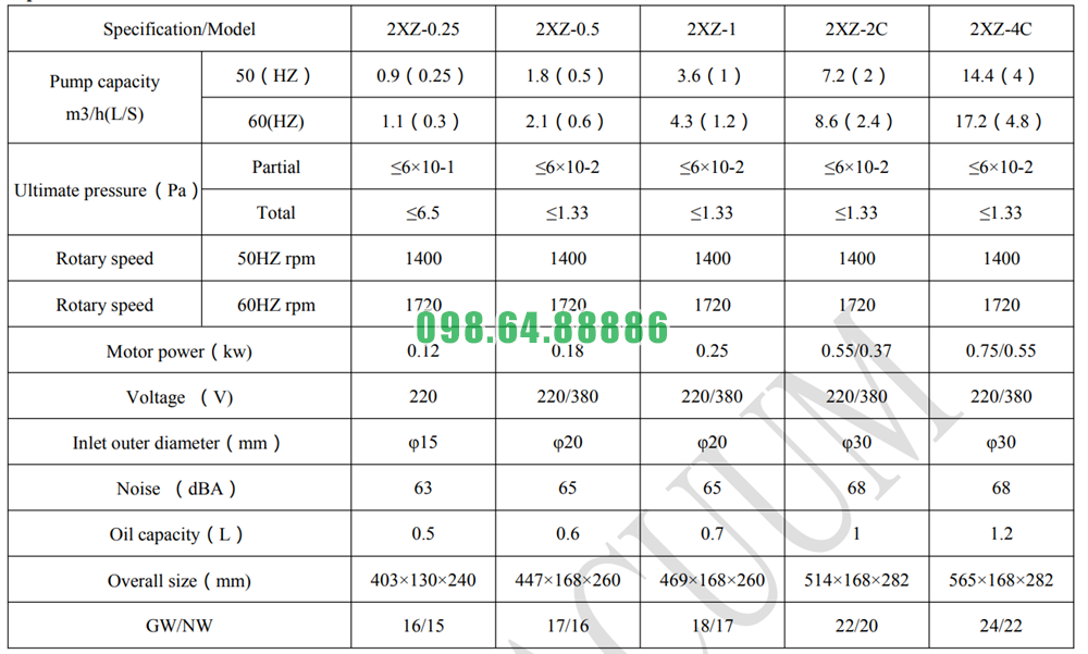 Bơm 2XZ-2 vận hành với: