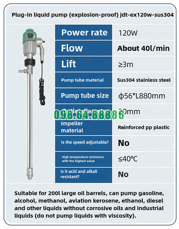 Ứng dụng thực tế của Bơm chất lỏng cắm điện chống cháy nổ JDT-EX120W-SUS304 tại kho xưởng mang lại nhiều lợi ích như tăng hiệu suất, đảm bảo an toàn và giảm chi phí vận hành. Với thiết kế phù hợp thùng phuy 200L, khả năng vận hành ổn định và tính linh hoạt cao, thiết bị là giải pháp lý tưởng cho các hoạt động bơm hút chất lỏng trong môi trường công nghiệp hiện nay.