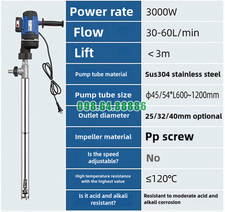 Máy bơm thùng phuy inox JDT-3000W-LGG120 có khả năng làm việc với chất lỏng có nhiệt độ lên đến 120°C và chịu được môi trường hóa chất ở mức trung bình. Điều này giúp thiết bị thích nghi với nhiều điều kiện vận hành khác nhau trong công nghiệp.