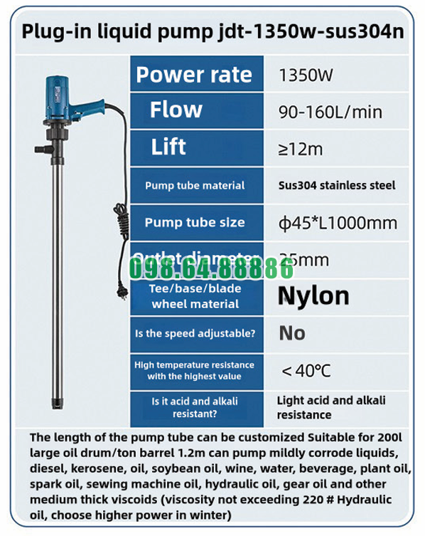 Máy bơm hút thùng phuy cắm điện JDT-1350W-SUS304N được thiết kế để bơm các chất lỏng có độ nhớt thấp đến trung bình và có khả năng chịu được các dung dịch kiềm nhẹ và axit nhẹ nhờ vào vật liệu inox SUS304 chống ăn mòn. Tuy nhiên, máy bơm này không phù hợp để bơm axit đậm đặc do một số lý do sau: