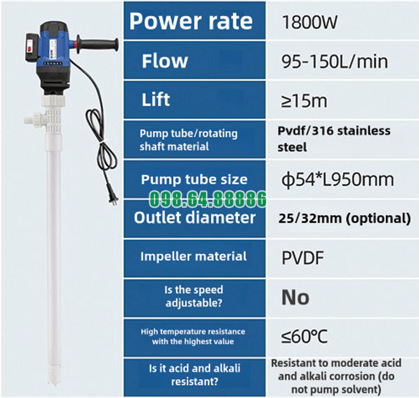 Nhờ khả năng vận hành êm ái, bền bỉ và hiệu quả, Máy bơm điện bơm chất lỏng thùng phuy JDT-1800W-PVDF trở thành lựa chọn phù hợp cho nhiều doanh nghiệp cần thiết bị bơm chất lỏng đáng tin cậy trong môi trường công nghiệp.