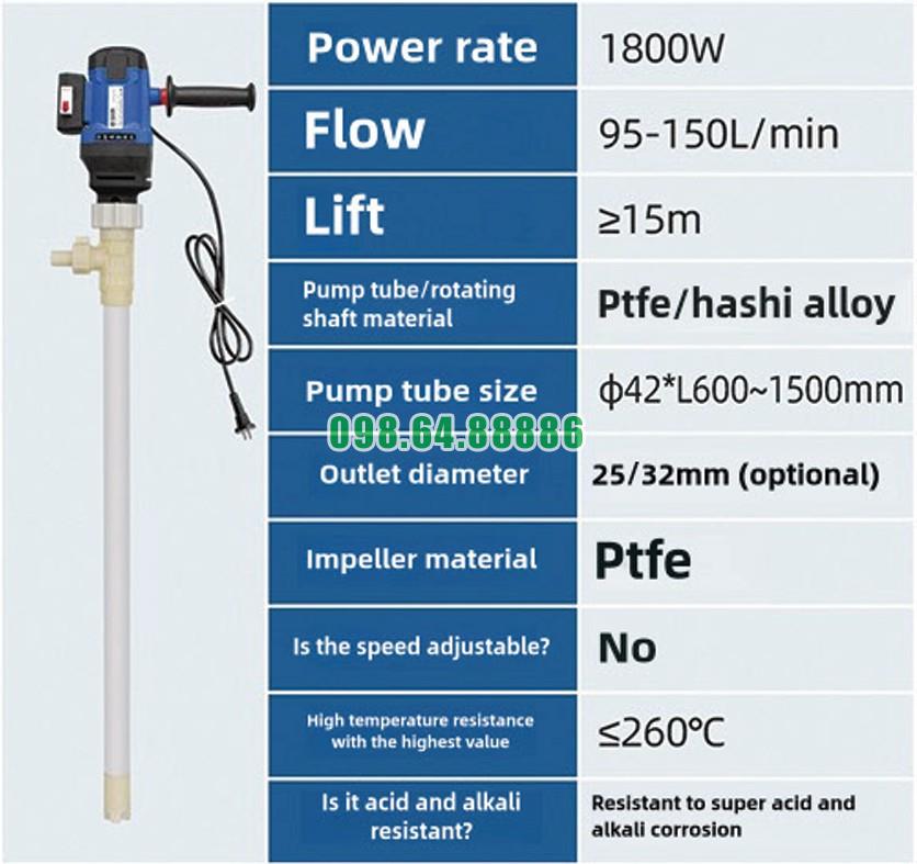 Bơm điện thùng phuy 200L JDT-1800W-PTFE – Sự lựa chọn số một cho ngành thực phẩm
