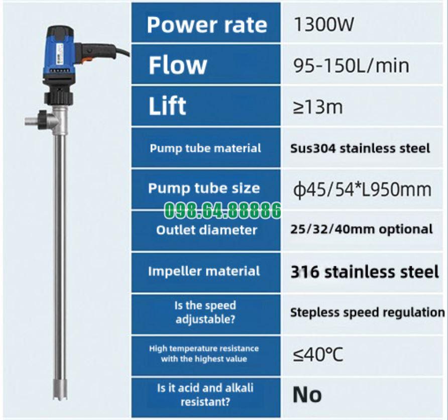 Trong thực tế sản xuất và chiết rót, mỗi loại chất lỏng có đặc tính riêng về độ nhớt, tính ăn mòn và khả năng bay hơi. Cách Bơm điện thùng phuy JDT-1300W-304SUS xử lý các loại chất lỏng khác nhau thể hiện rõ tính linh hoạt và khả năng thích ứng của thiết bị trong nhiều môi trường làm việc.