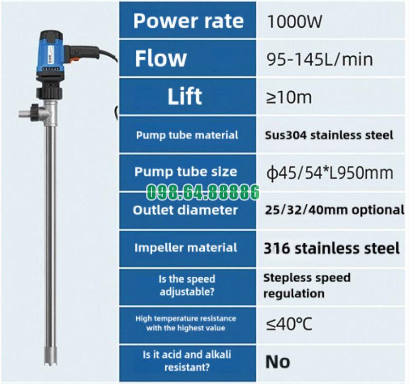 Bơm cắm điện thùng phuy JDT-1000W-304SUS có thể vận hành liên tục trong thời gian dài mà không suy giảm hiệu suất, phù hợp với các quy trình công nghiệp không gián đoạn.