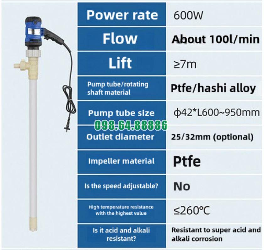 Bơm chiết hóa chất từ phuy 200L, ống PTFE chịu nhiệt model JDT-600W