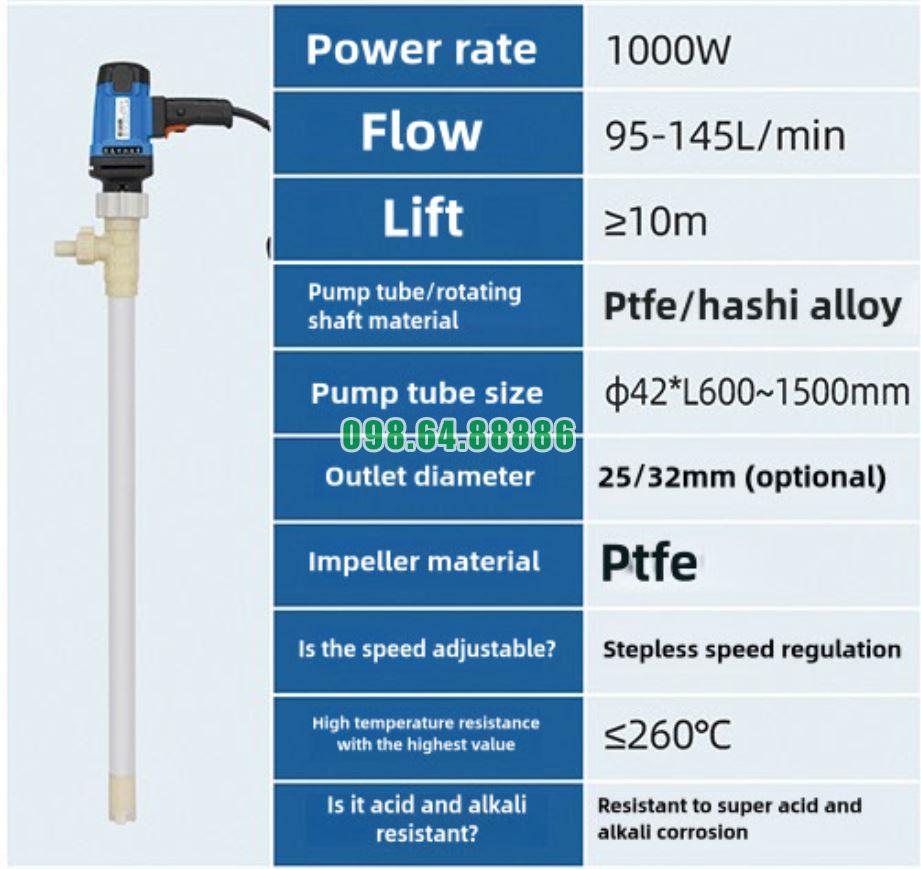 Bơm điện nhúng thùng phuy hóa chất model JDT-1000W-PTFE