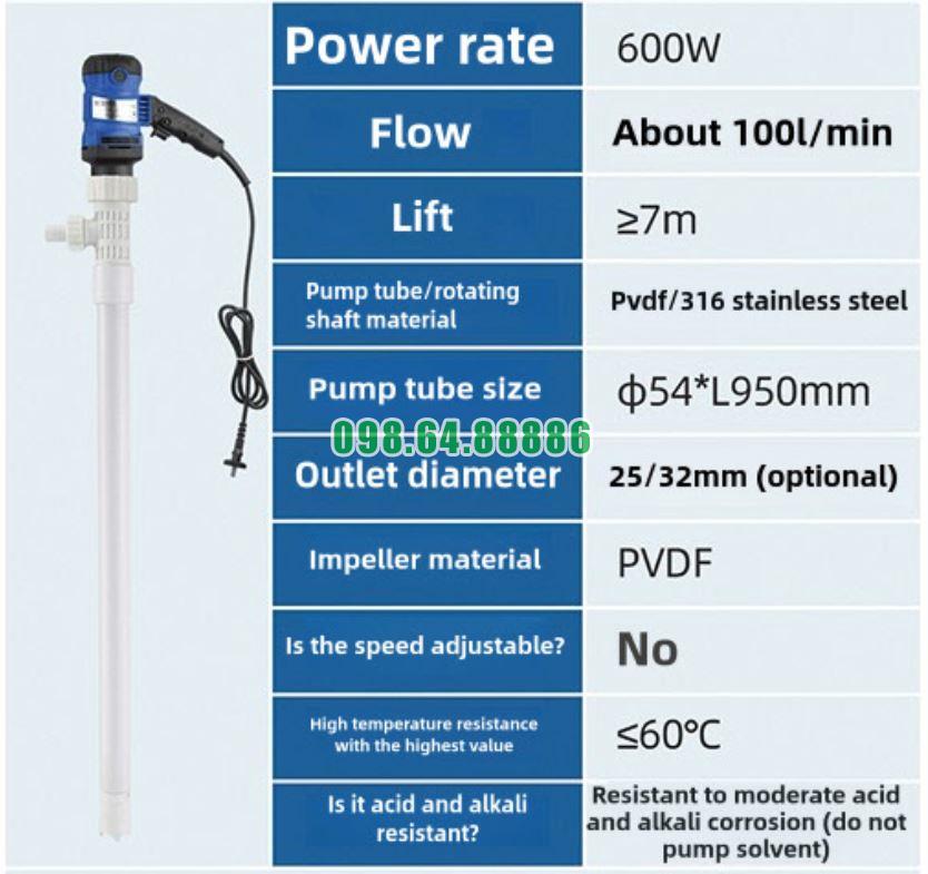 Bơm phuy hóa chất, dầu nhẹ, nước JDT-600W-PVDF