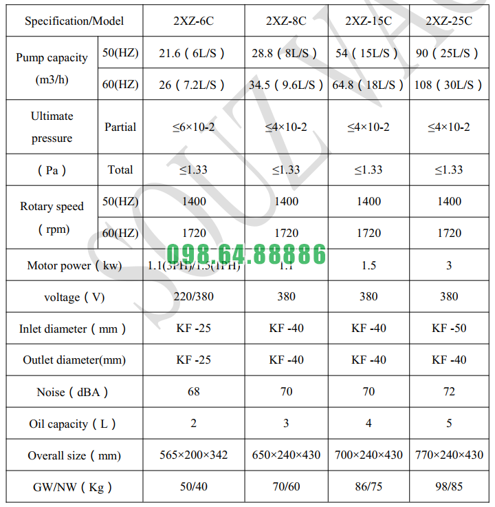 SouzVac 2XZ-6C công suất 1.1 kW phù hợp: