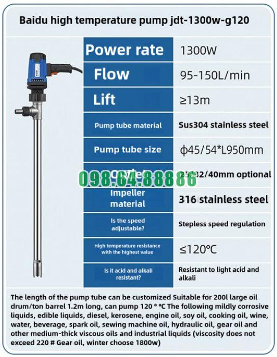 Bơm thùng phuy dầu nóng JDT-1300W-G120